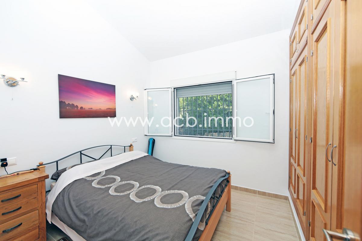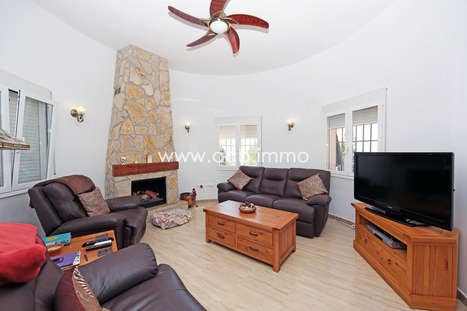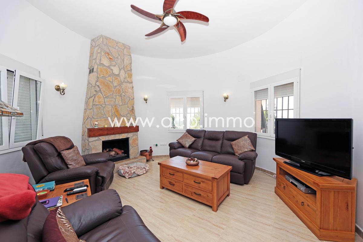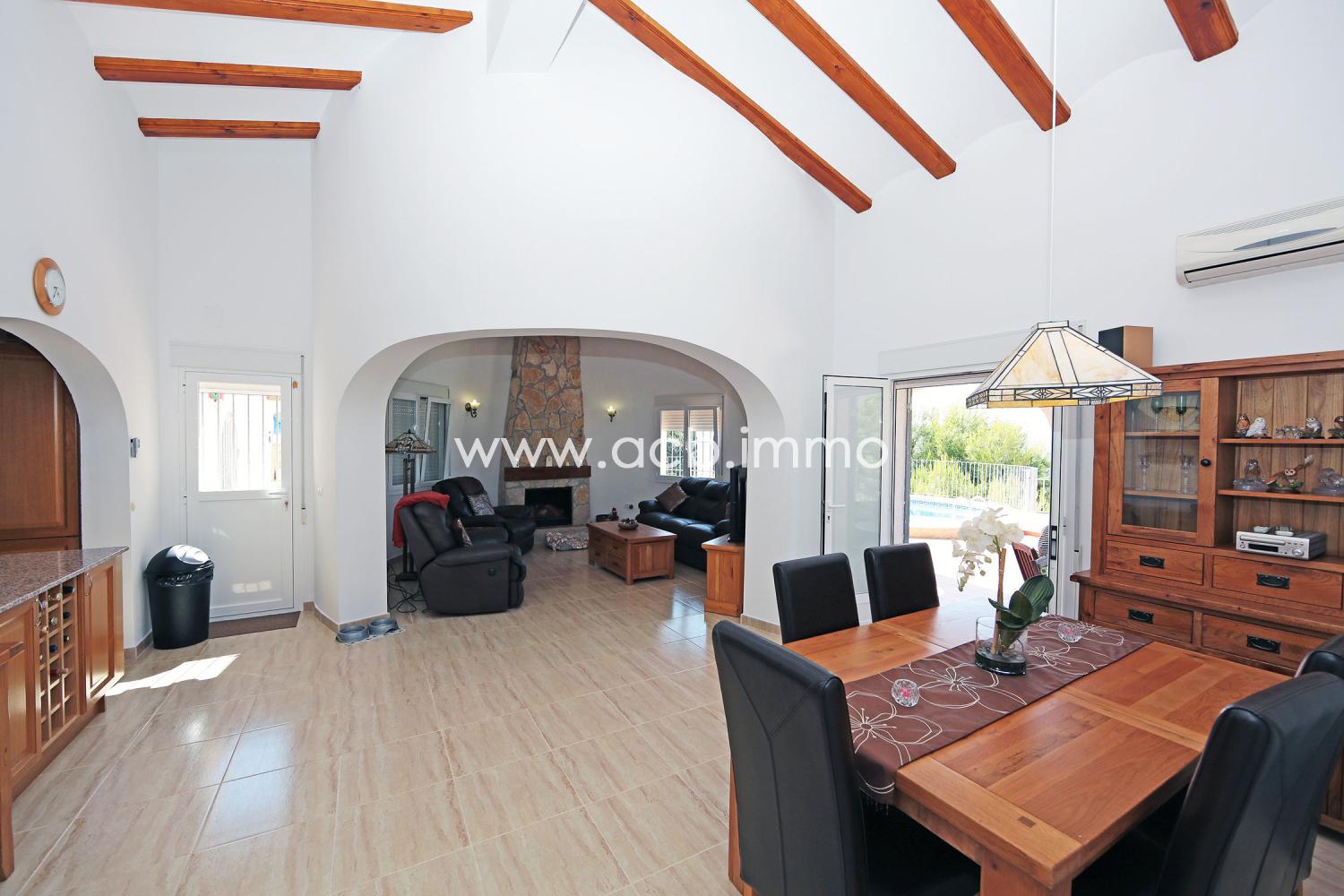 La villa de alta calidad de construcción y perfectamente mantenida tiene un gran salón/comedor con chimenea y aire acondicionado, una cocina equipada, un dormitorio doble con armarios empotrados y aire acondicionado, un segundo dormitorio doble con aire acondicionado y acceso a la terraza, un aseo con ducha y WC y un dormitorio principal con armarios empotrados, aire acondicionado, acceso a la terraza y baño privado con bañera, ducha y WC.