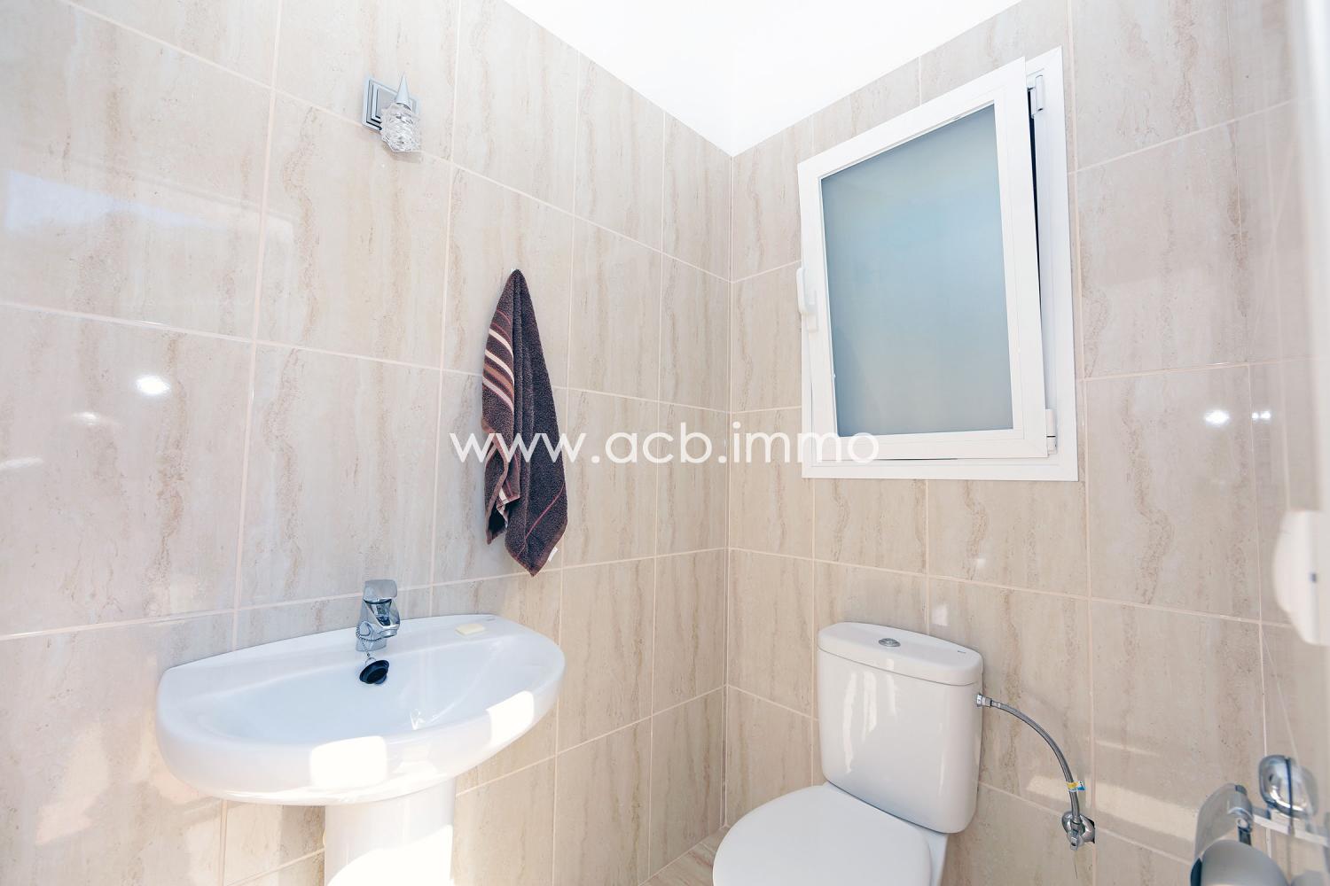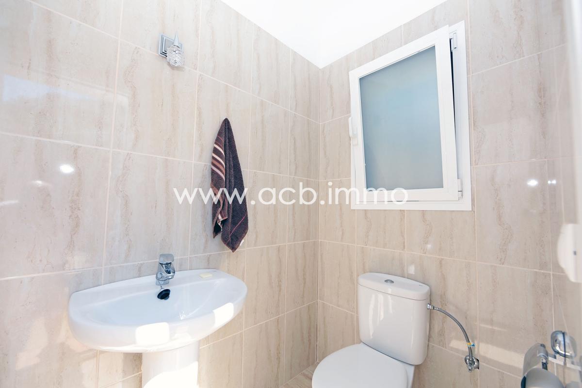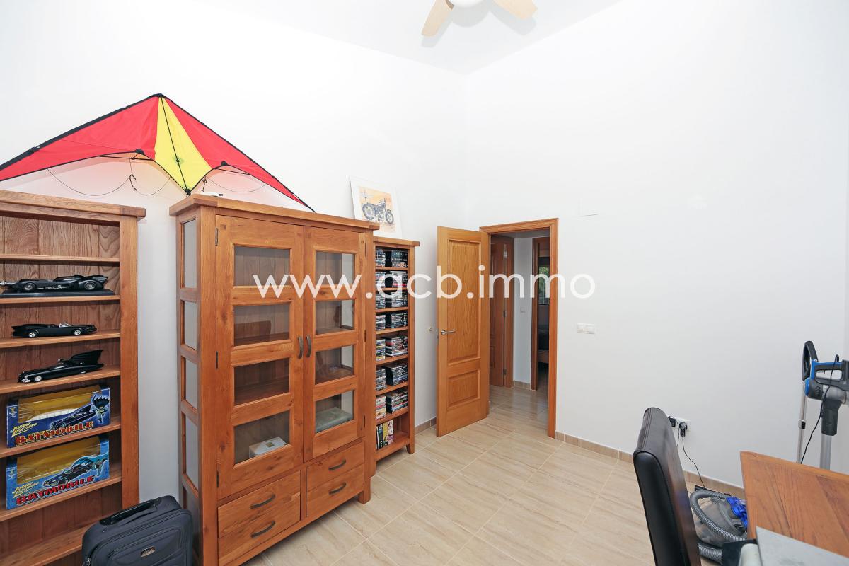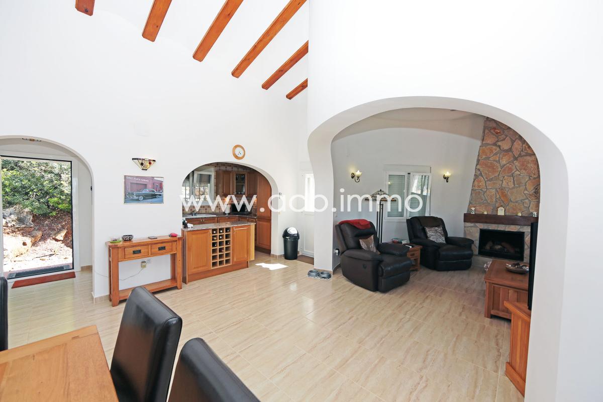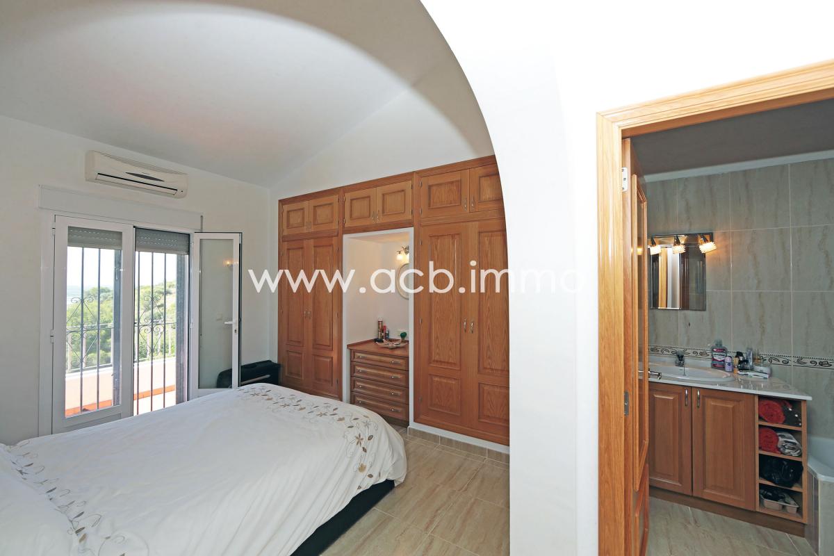 La villa de alta calidad de construcción y perfectamente mantenida tiene un gran salón/comedor con chimenea y aire acondicionado, una cocina equipada, un dormitorio doble con armarios empotrados y aire acondicionado, un segundo dormitorio doble con aire acondicionado y acceso a la terraza, un aseo con ducha y WC y un dormitorio principal con armarios empotrados, aire acondicionado, acceso a la terraza y baño privado con bañera, ducha y WC.
