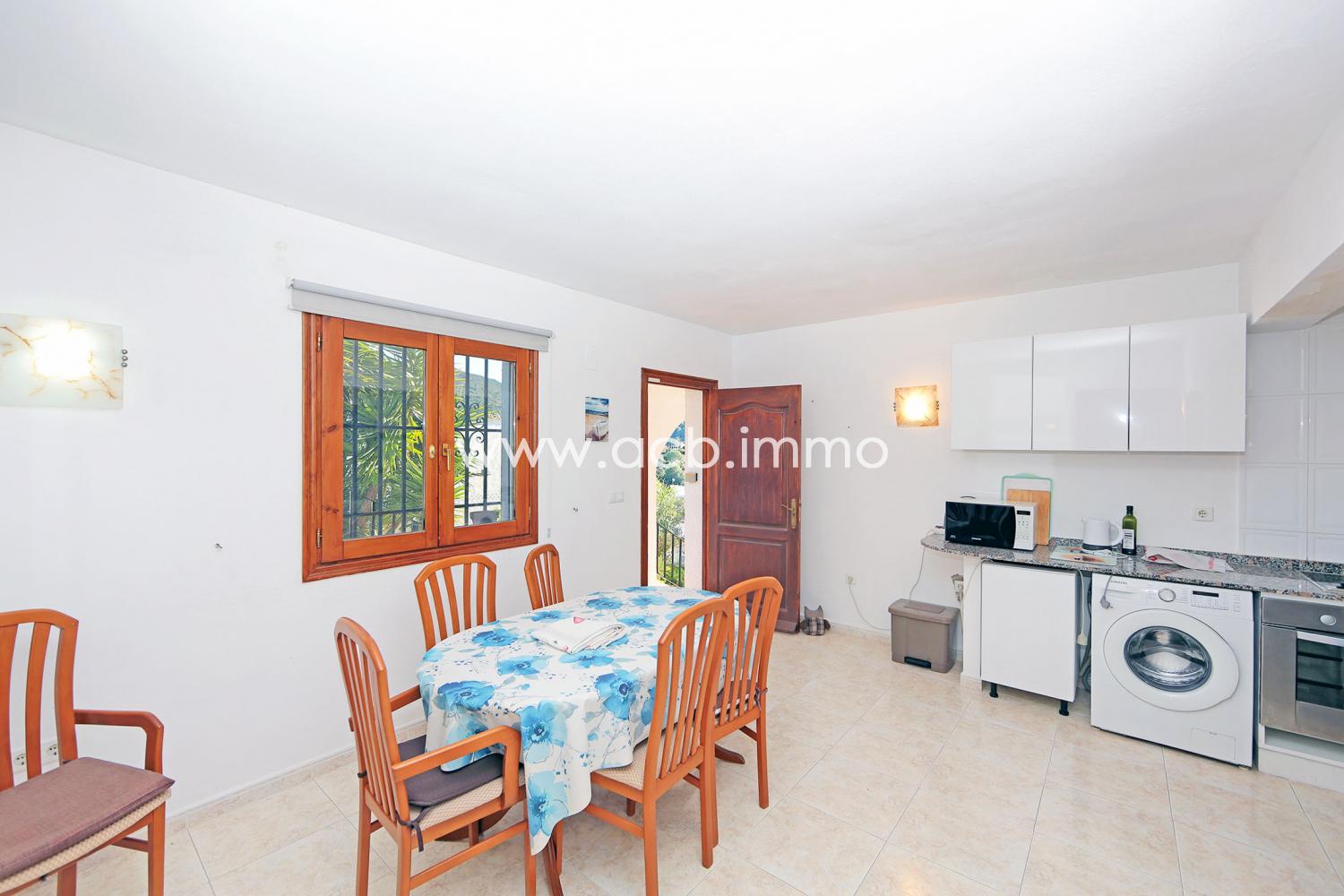 La villa principale dispose d’un vaste et lumineux espace de vie, comprenant un salon - salle à manger ouverts sur l’extérieur, ainsi qu’une cuisine récemment rénovée, moderne et fonctionnelle. Les grandes ouvertures permettent de profiter pleinement de la vue mer depuis les pièces de vie.